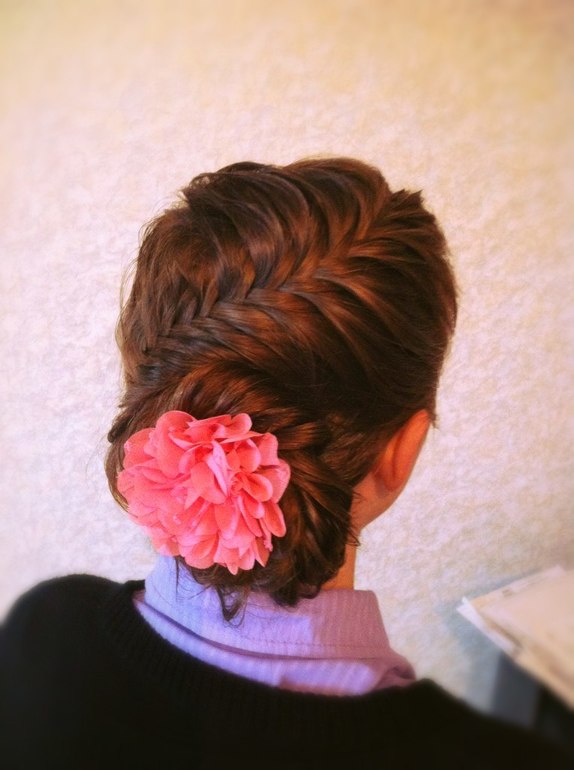 да это колосок рыбий хвост . внизу ничем не закрепляется , а вот сам пучок крепится очень большим количеством шпилек и невидимок . когда плету использую гель или воск , чтобы волосы не пушились . и по желанию заказчицы залила все сильно лаком . это плели на выпускной и было важно , чтобы коса продержалась сутки .