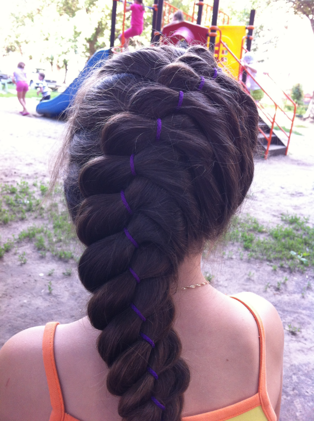 первая коса -это 3 пряди волос + лента . а вторая -это 2 обычных колоска , а потом в пятипрядкую косу соединила .