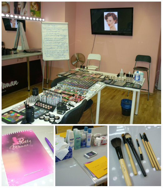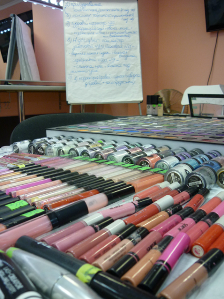 В оборудованном и удобном классе-салоне нас обеспечили материалами для обучения: фирменными блокнотами, ручками, набором различных кистей и профессиональной декоративной косметикой марки Jeans (производство Южная Корея "EVAS Co. Ltd").