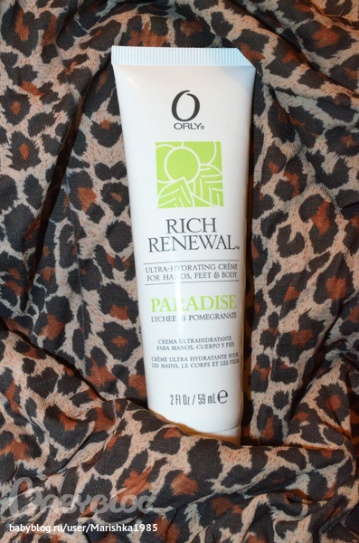 Очень нравится продукция Orly. Поэтому, не задумываясь, купила и крем для рук этой фирмы. Полное название крема RICH RENEWAL PARADISE. Производитель заявляет, что крем является восстанавливающим для рук, ног и тела. Крем имеет сладкий запах экзотических фруктов, который остается на руках довольно продолжительное время. Наносится очень легко, т.к. текстура легкая. Сразу после нанесения кожа просто бархатная, очень приятная на ощупь. Ручки кажутся очень увлажненными..........., но недолго, особенно в зимнее время, когда кожа рук очень сухая. Лично я разочаровалась в нем и купила крем другого производителя. Но у меня кожа очень сухая, поэтому думаю, что для девушек с более удовлетворительной кожей крем подойдет. Ну а для девушек с очень сухой кожей это не тот вариант. Хотя в теплое время года крем может быть находкой.