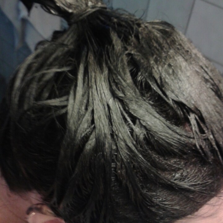 Наносим на волосы, сперва я красила корни, потом равномерно распределяля на концы. Краска красится очень мягко, прокрашивая все волосинки. После нанесения крем-краски, блесток я уже не видела. И так ходила 30 минут (я любую краску держу 30 мин.).