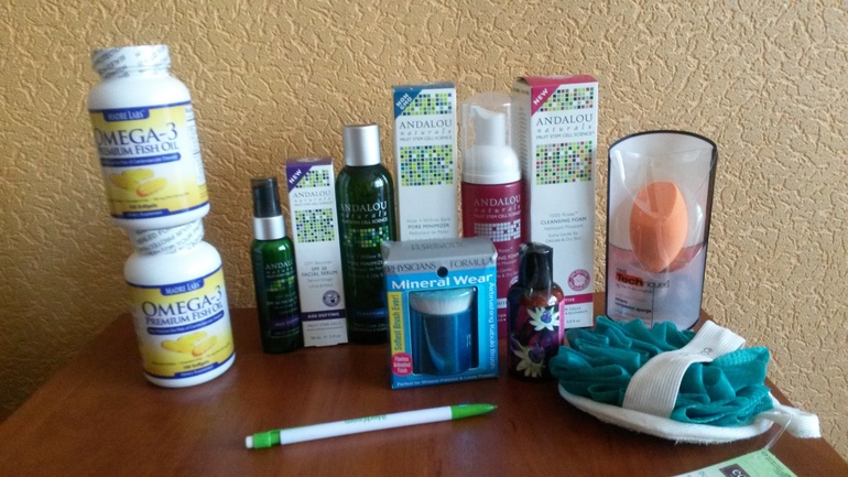 Обзор косметических средствПродолжаю свое знакомство с продукцией с данного сайта. Начиталась много похвал про серию andalou и заказала тоник для сужения пор,пенку умывашку и сыворотку с спф 30 (что для меня весьма актуально). Омега 3 объем большой брала на себя и мужа. Мочалка двухсторонняя экотулс ,качество отличное,одна сторона полирует кожу. Пилинг кислотный для лица ,спонж яичко для вв крема и мега кисть для пудры и тоналки...кисть просто отличная,смотрела ролики про нее и не верила,что она такая нежная,а зря))))кисточка отлично наносит пудру и растушевывает ее.