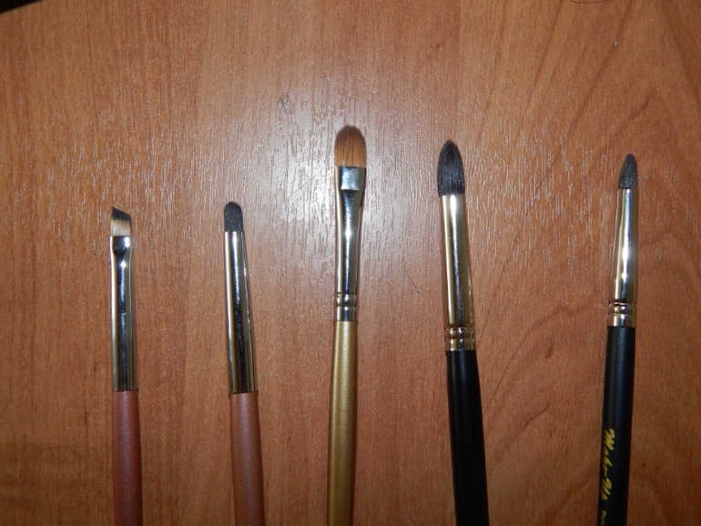1 скошеная кисть упругая для ресничного края и стрелок.2 растушевка синтетика с натуральным ворсом для карандашика подводки и т.д 3 нанесение теней растушевка карандашной техники супер кисть!!! 4 для растушевки просто волшебница белочка нежная такая . 5 кисть для растушевки акцентов мелких.