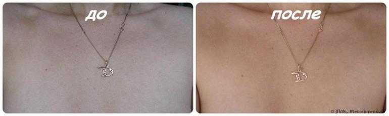 на нижней фотке "загар" добыт путем редактирования фото. смотрите на кулончик с цепочкой — металл тоже "загорел" автозагар с силиконами, у чувствительной кожи от него могут быть вполне прыщи. наносить автозагар надо на кожу после хорошего увлажнения и скрабирования. если не желтит, то отлично.