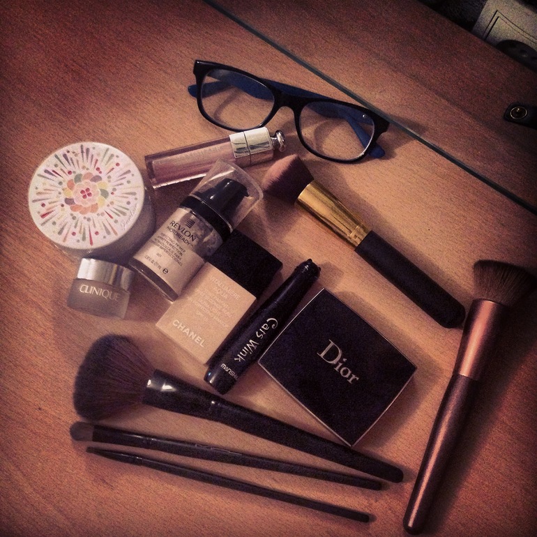 Это моя) Немного не попорядку 1. Базой под макияж от Летуаль пользуюсь редко, попоскольку лежит в косметичке, сфотографировала. Не знаю как повелась на нее, не нравится. Пользуюсь ей под тональный шанелевский когда кожа шелушится.2. Средство для осветления тёмных кругов под глазами от Бенефит. 3. Тональный крем Шанель Виталюмьер как у вас. Летом я с ним дружила, водянистый, не забивает поры, лёгкое тонирование. К осени мы разругались, у меня появились шелушения , а он их только подчёркивает. Покраснения не может скрыть. Сейчас нормально ложится только под базу. Пока ещё в косметичке, но пользуясь уже редко им.4. Мой старый дружок — тональный крем Шисейдо для сухой кожи. Для зимы для меня идеален.5. Жидкий консиллер Шисейдо. Тёмные круги убирает хорошо, веки не сушит, морщины не подчёркивает особо.6. Тушь Риммель Скэндалайз. По велась на большую кисточку. Зря. Медленно сохнет, это нервирует т.к. краситься обычно приходится очень быстро.7. Маркер для стрелочек от Ревлон. Удобно для рисования экспресс стрелок)) Есть ещё Инглот, но он не в косметичке, кисточкой у меня не очень получается, долго точнее.8. Тени, кажется Макс Фактор. Матовые. Покупала давно , посчитала их слишком рыжими. Снова стала пользоваться недавно, т.к. мои разбились ((9. Карандаш для бровей Ева Мозаик кажется. Супер удобная щеточка для растушовки!! Иногда подвожу им де уголок века.10. Круглый бальзам для губ Чаптер с ароматом малины и амариллиса. Дарила подруга. В целом неплохой. Ооочень вкусно пахнет))11. Блеск для губ Эсти Лаудер, оттенок 07 Перл. Бледно-розовый перломутровый с золотистым шиммером. Подчёркивает все шелушки на губах, поэтому никак не могу его " прикончить".12. Помада Риммель Кисс оттенок 80. Люблю её. Уже вторая. Губы не сушит.Фух, кажется все))Пудры нет в моей ежедневной косметичке, пользуюсь ею редко. Фотографировать не стала.Румян сейчас нет, с ними случилось тоже несчастье что и с тенями (( Были Сефора. В поиске новых, пока межуюсь между Шисейдо и Диором как у вас. Поэтому прошу отзыв поподробнее))) Важно пользуетесь ли вы кистью той что в комплекте, т.к. планирую ей пользоваться на работе.
