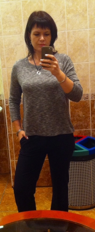 Или же сменить черные брюки на зеленую юбку. Я плохо умею выражать картинки из головы в слова, но на мой взгляд такая серая кофта - основа, база. Она должна служить фоном для акцентов. Да и серый сам по себе пасмурный цвет, а в сочетании с ярким цветом он преображается.