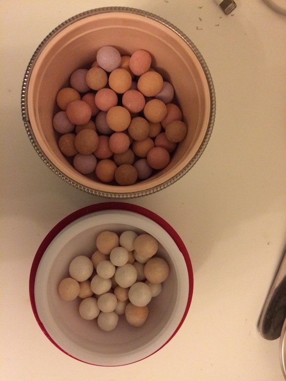 У меня то же эти. Мне нравится ими пользоваться и я вижу их на лице. А запах какой!!! Пробовала один розовый шарик потереть на ладонь, потом набрать кистью и вместо румян!! Очень красивый розовый румянец получился. А еще беленький блестящий шарик использовала на веки в уголки. С метеоритами можно экспериментировать!!