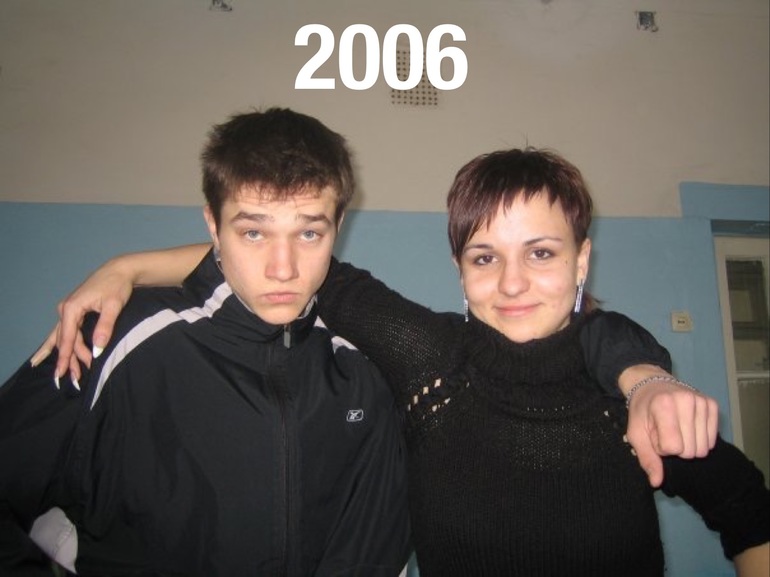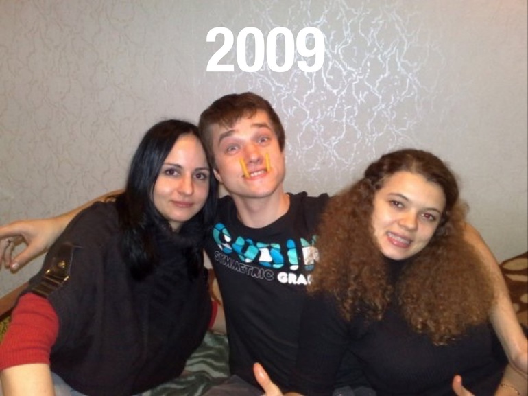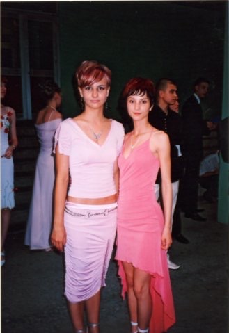 Это мой выпускной из школы, я слева: волосы в цвет платья, в один день из черного в светлый. Один из самых сильных моих экспериментов над волосами.