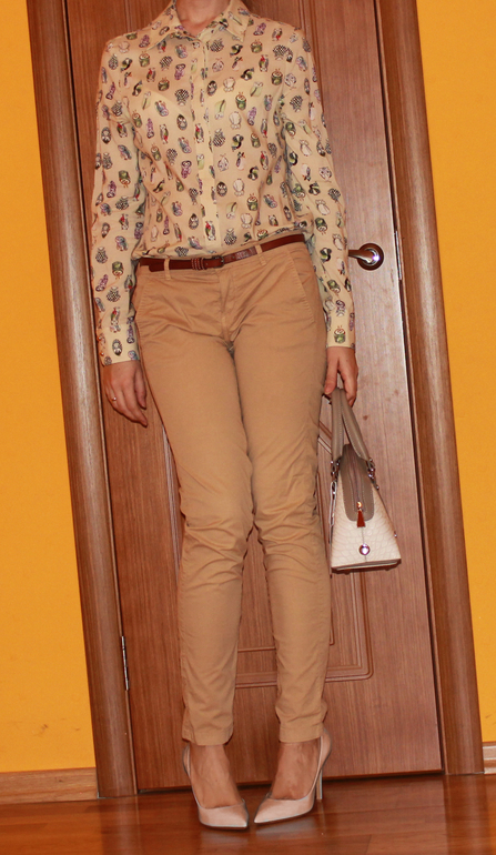 Бежевые туфельки просто отлично, если от каблука ноги не устают. Только брючки бы стрейчевые, чтобы в обтяжку и складочек таких не будет.