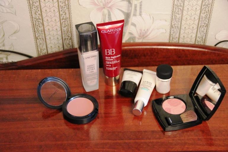 Во-первых, открыла для себя базу под тональник. Купила вместе и базу и тональник от Ланком, очень мне подошло! Идеально скрывает мои поры. Вв от кларинс не произвел впечатления. От МАС пигмент ванилла и румяна, как то неоднозначно, в плане не понимаю нравится как на мне или нет. А вот от румян от шанель я в восторге, очень классные, хорошо ложатся, отлично смотрятся.