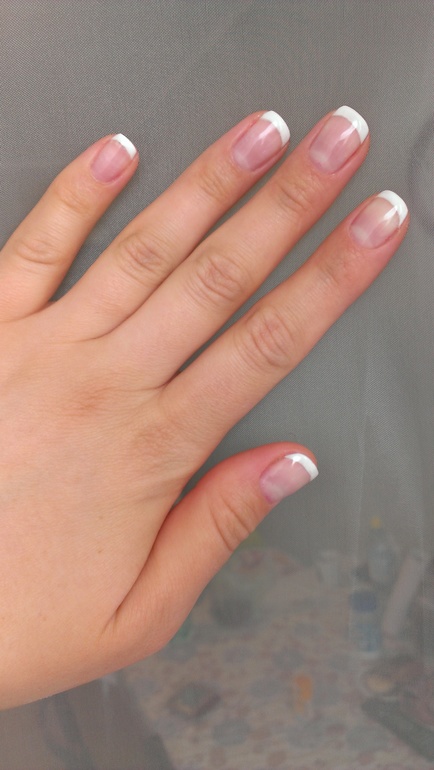 Если есть гель-лак для френча, то можно сделать так: база, слой гель-лака бежевого, далее рисуете кончик белым цветом, далее топ.