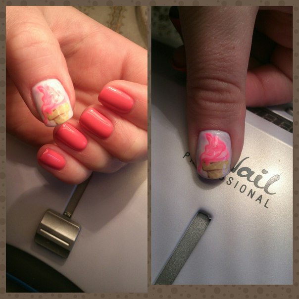 Гель-лаками и тонкой кисточкой ) цвета розовый,белый,темно-серый,жёлтый.Вначале смешала серый-беоый-желтый, что бы получился светлый цвет,сделала набросок стаканчика , потом светло розовым сделала набросок,мороженого. Всё просушить.потом ярко розовый нанесла и сразу белым стала делать разводы, потом просушить. Потом опять смешала серый-беоый-желтый но уже темнее сделала тени, просушить. Потом жёлтый и белый,нарисовала на стаканчики квадратики, просушить.и уже темно серым выделила очертания стаканчика. Всё рисовала на белой подложке, но мне не понравилось и вокруг мороженого сиреневый и голубым цветом сделала разводы вот))