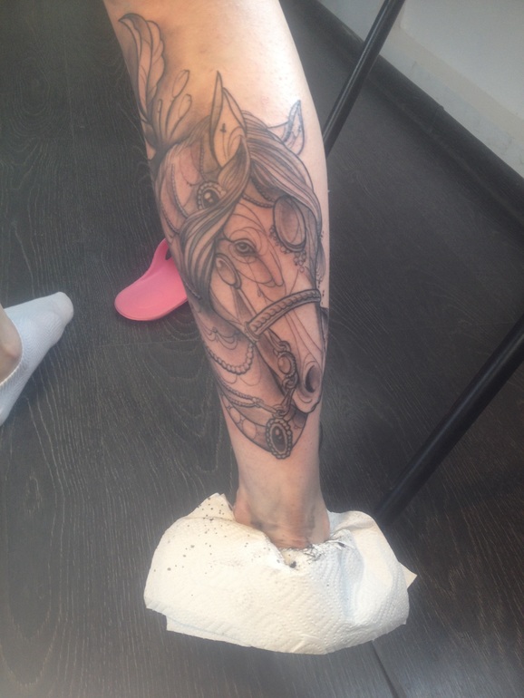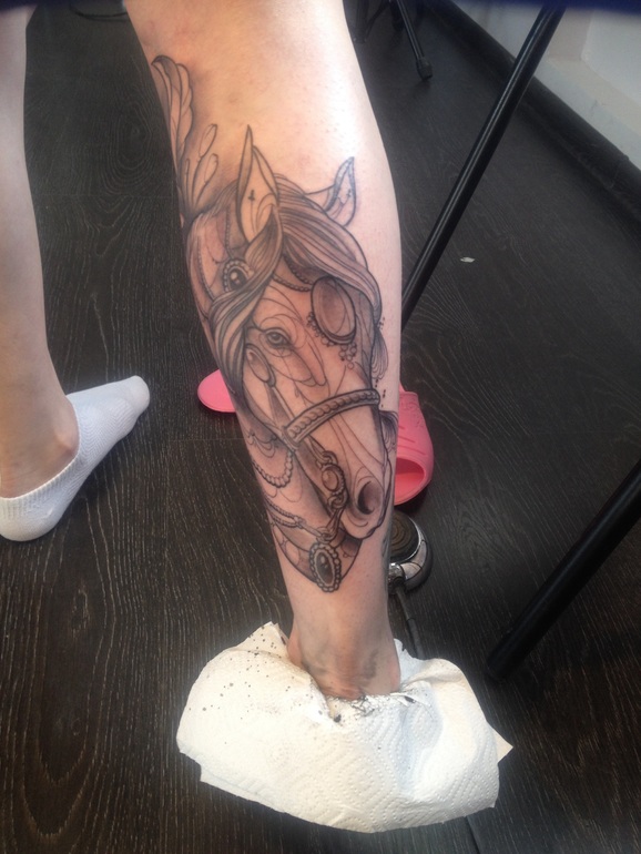 это моя первая нормальная татушечка) был вот такой узор,переделали на кролю) а лошадка вторая...сегодня забили)я так рад,я так рад)все на одной ноге!)кровля сбоку,лошадка взади на икре,до колена!) стили разные,но всё равно мне очень и очень нравится!) вторую били 3 часа,последний час я уже вся испсиховалась,терпела 2 часа,а третий тяжко дался!) ну вот,все муки пройдены,теперь осталось зажить и все)