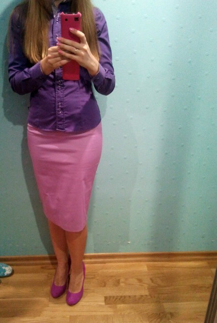 Попробую, спасибо за идею) Единственная проблема - первую блузку навыпуск не наденешь, она длинновата и не приталенная. А если заправить, боюсь в юбке опять живот будет торчать, как в случае с заправленной фиолетовой. Но попробовать можно - вдруг нормально ляжет под юбкой)