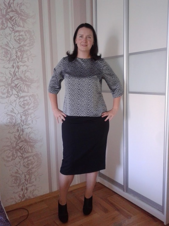 Мне кажется, юбку коротить до колен надо, и блузку внутрь, или чтоб линия тилии была выше! А то низ массивно смотрится.