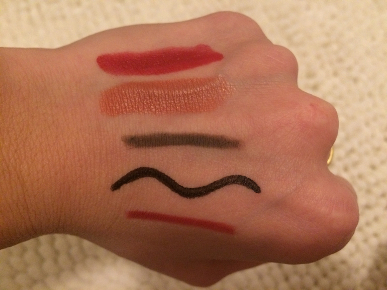 На моей руке: красная помада, помада карамельного цвета, коричневый карандаш, черная подводка, розовый карандаш для губ. Далее под кат...