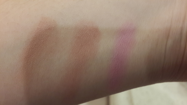 В палетке 2 уровня: на первом красуются 3 вида румян в оттенках Enrapture(матовый теплый цвет чайной розы, но больше уходящий в беж), Enthralled (похож на enrapture, но с шиммером и более холодные), Roman holiday(матовый холодный розовый). Румяна отлично пигментированы, не пылят.