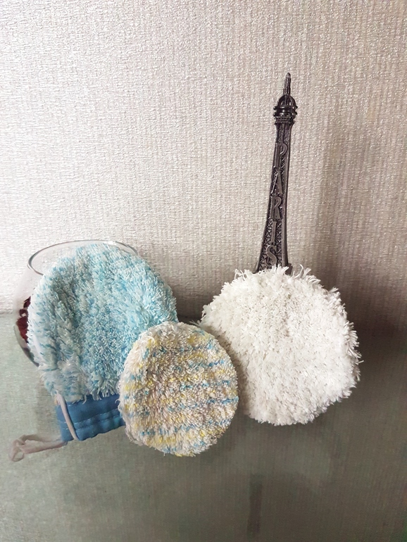 Изначально у меня была голубая варежка для лица и маленький кружочек для глаз. Покупала я их.....вот не совру лет 5 назад, если не больше. Недавно решила подарить такие подруге на др, а оказалось, что теперь их выпускают только в виде большого белого кружочка (на фото справа) для лица и маленького белого кружочка (на фото его нет, но по размерам как полосатый) для глаз. Себе взяла только для лица, чтоб попробовать. И теперь по использованию: мочим водичкой и просто протираем лицо. Косметика смывается на 10+ по пятибальной шкале ))) Очень выручает именно для глаз, т.к. глаза у меня очень чувствительные и сколько средств я не пробовала для глаз, потом всегда плачу и хожу с красными опухшими глазами беспробудного алкоголика. Смывает даже водостойкую косметику, просто придется немного потереть, однако кожа при этом не тянется. Но такой косметикой я практически не пользуюсь (разве что мои экзекуции с гримом