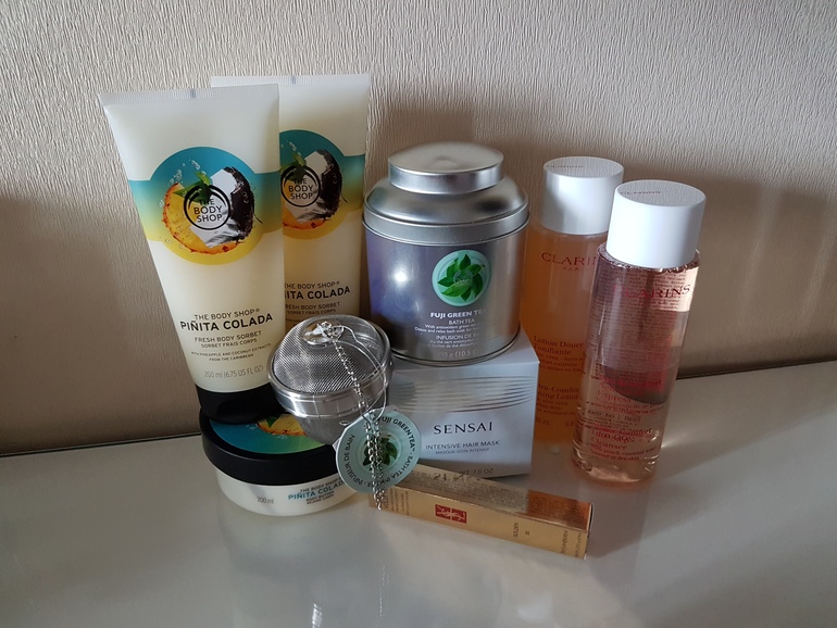 Тоники Clarins взяла больше по необходимости из-за жары. Персиковую водичку (прозрачная бутыль, для нормальной и сухой кожи) обожаю уже давно, покупаю регулярно, т.к. отлично освежает кожу лица, и очищает поры, именно фейс без макияжа (особенно когда с тебя семь потов под вентилятором сходит); можно и макияж смывать, но для смывки мейка мне она не нравится. Второй тоник, освежающий и очищающий (для норм и сух кожи) взяла первый раз, ну собственно тоже из-за жары, поры почистить. Посмотрим, попробуем что за зверь такой.