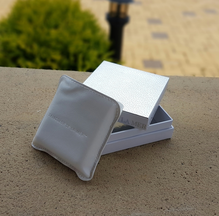 Сама пудрочка лежит вот в таком вот белом кожаном чехольчике. Не знаю на сколько кожа натуральная, но на ощупь безумно мягкая