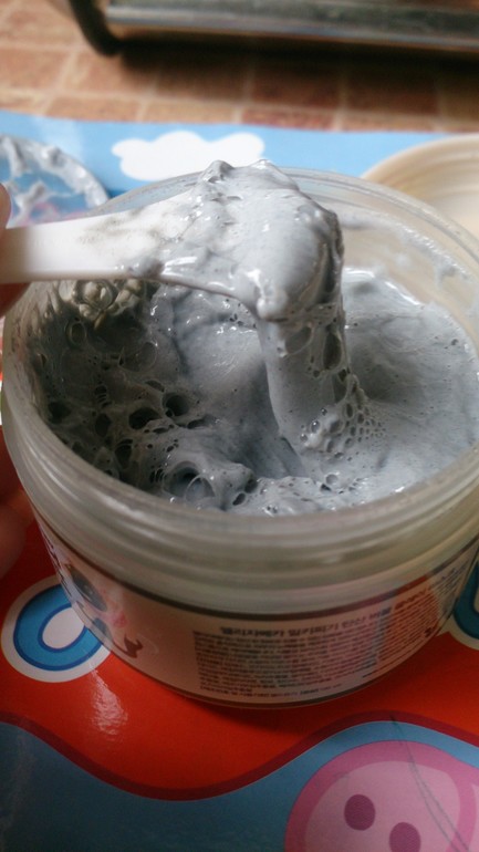 Баночка, которая была запаяна пленкой-защиткой от вскрывания, и которая, естественно, не сохранилась) Баночка пластиковая, особо не привлекательная, простая, как три копейки, с изображением милой хрюшки на корпусе. Самое интересное: Баночка стограммовая, но продуктом заполнена только половина места, это хорошо видно на просвет. Но не суть. Внутри баночки защитная мембрана, вскрыть которую лично я могу только зубами, в принципе, понятно, почему там такая плотная крышка - ведь от соприкосновения воздуха и продукта маска начинает вступать в реакцию и пузыриться, видимо, поэтому масса так плотно запечатывается (чтобы случайно не произошло атомного взрыва внутри банки))). Для удобства нанесения в коробочке есть лопатка, но! Поверьте моему опыту)) Пока этой лопаткой наковыряешь маску, она сто раз вспузырится и осядет, я предпочитаю брать продукт рукой и наносить с помощью пальцев.
