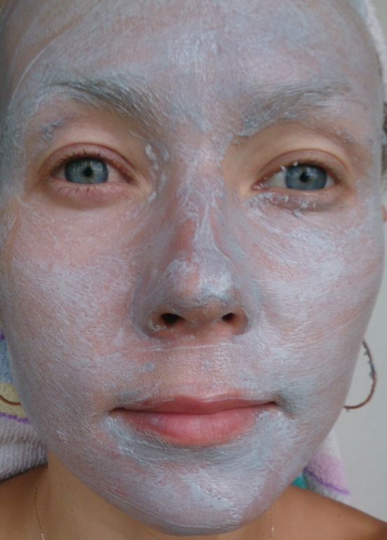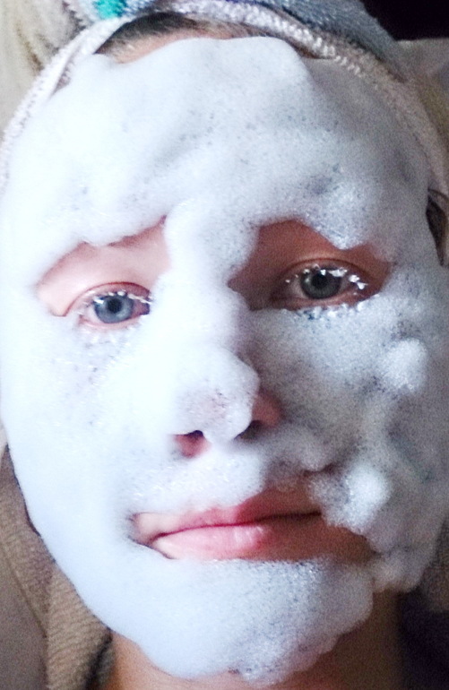 Вот нанесли вы маску и чувствуете, как ваше лицо начинает щекотать) Ощущения очень приятные. нет, лицо не зудит и не чешется, а именно нежненько щекочет. При этом маска ощутимо пощипывает, и это пощипывание длится на протяжении всего времени. Маска пузыриться начинает сразу, поэтому мне не удалось сфотографировать себя в «непузырящейся» маске, ловите фото уже в состоянии «одедоморозивания»: