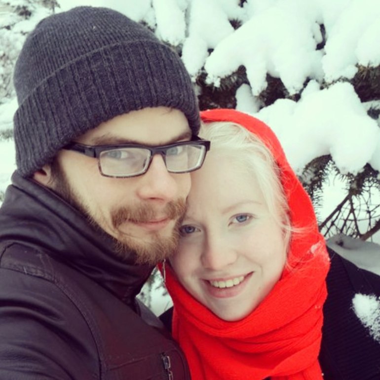 В красном платке/шарфике, просто офигенная фотка ) русская красавица Настенька )