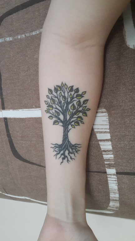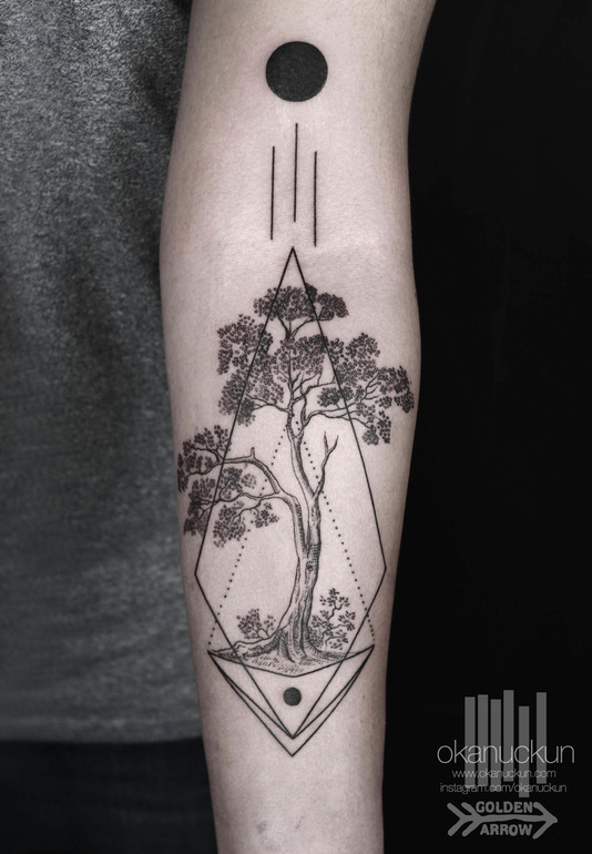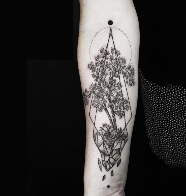 Очень нравится с геометрией, но на чужих тату они в одной стилистике, деревья более утончённые и чб, у вас с цветом, листики широкие, не уверена что геометрия будет смотреться в тему. Если мастер сможет найти органичный вариант, я б добавила.