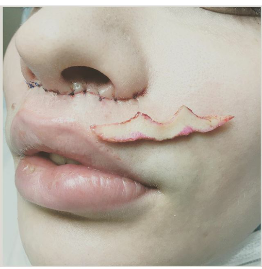 Ой, а я люблю всякие видюшки про операции посмотреть, на первом фото, как я понимаю кусочек кожи вырезали, приподнимали губу. А вот на остальных непонятно, зачем швы снаружи, неужели недьзя было изнутри рта сделать надрезы, чтоб было не видно?