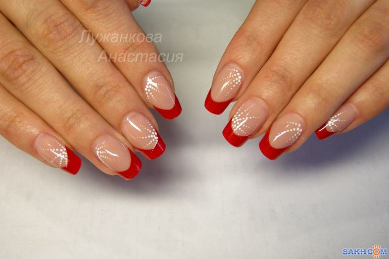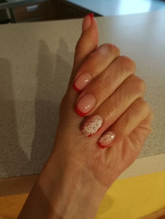 Мне нравится красный френч, но вот как цветочки перекрывают его - не очень(( Я бы сделала что-то подобное, если хочется беленького добавить
