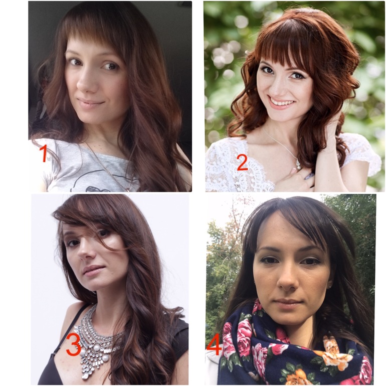 Эксперименты со внешностьюЗадумалась я тут внести изменения в свой привычный цвет волос. И вот думаю, стоит ли заморачиваться? Я периодически меняю оттенки окрашивания, но ничего радикального. 1. Почти натуральный в один цвет 2. Рыжий 3. Темнее натурального, с рыжими прядками 4. Темный .