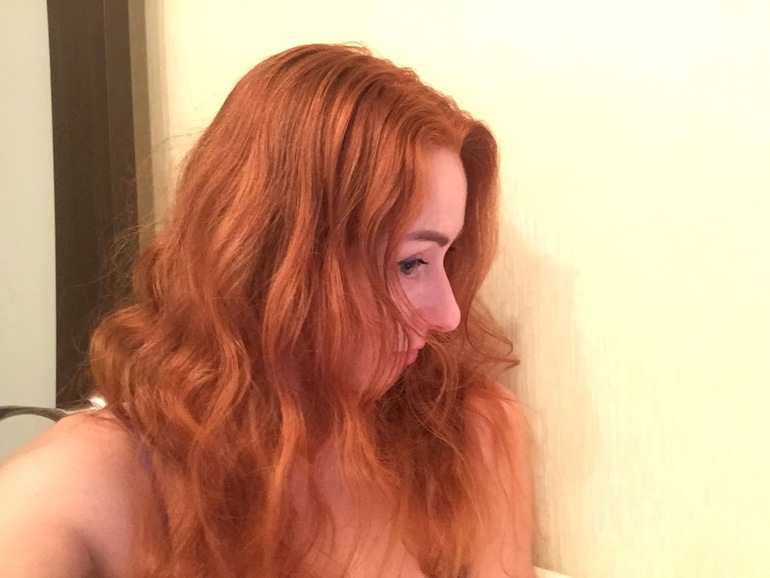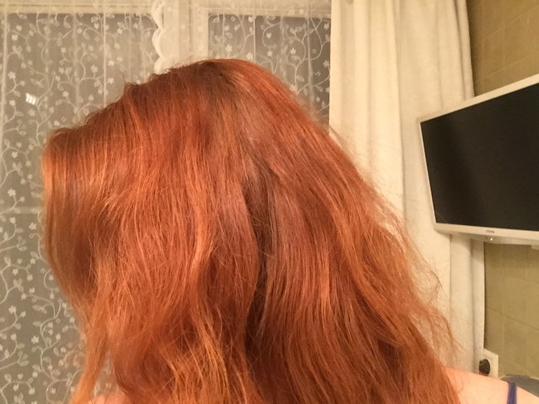 Окрасилась неравномерно почему-то, сзади больше своего натурального цвета, спереди у лица больше в красноту((((( Сушила сейчас просто на воздухе, без фена и укладок конечно же..