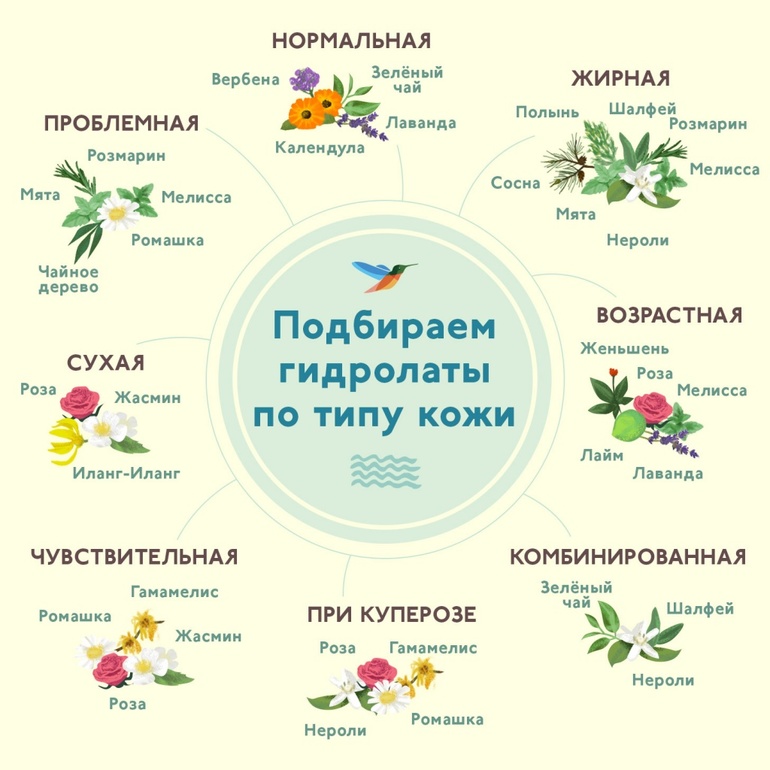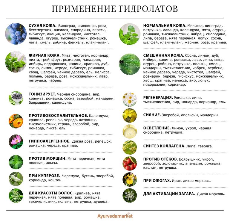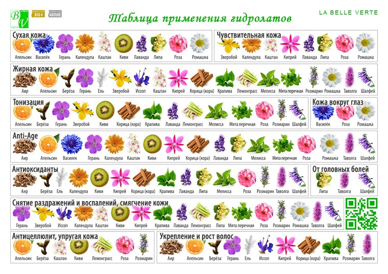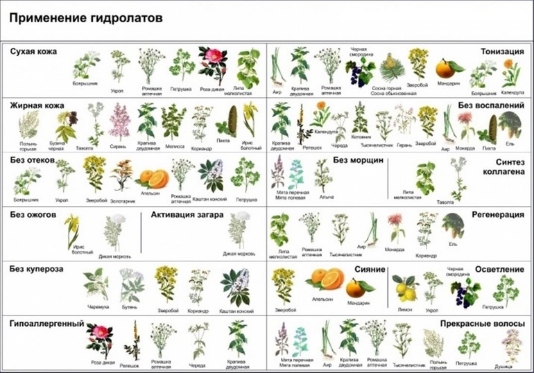 В фотогалереи вы можете увидеть таблицы гидролатов для разных типов кожи и разных проблем, пользуйтесь на здоровье! Прекрасная таблица есть на Ярмарке мастеров: https://www.livemaster.ru/topic/1657387-gidrolaty-tablitsa-primeneniya