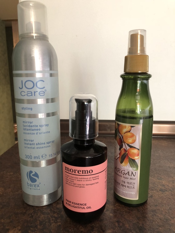 Затем спрей с Аргановым маслом на следующий день по всей длине. Разглаживает, убирает *пушистость* и придаёт блеск.