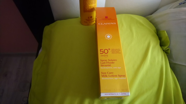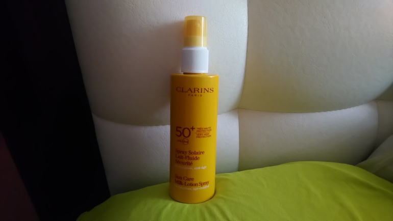 Так вот, мой отзыв будет как раз о таком солнце защитном средстве, с очень сильной защитой SPF 50. Называется средство - Spray Solaire Lait-Fluide Солнцезащитное молочко - спрей для лица и тела SPF 50 от Clarins.