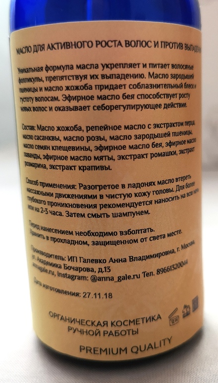 Довольно высокая стоимость масла ANNA GALE неизбежно вызывает любопытство: с чем это связано? Внимательно изучив состав, могу подтвердить, что производитель отнюдь не пытается в тридорога продать нам обычное репейное масло. Нам предлагают эксклюзивную смесь масел-основ с эфирными маслами и экстрактами премиум класса (аналоги мне не встречались). Это полностью натуральный продукт без вредных добавок, ручная работа, не массовое производство.