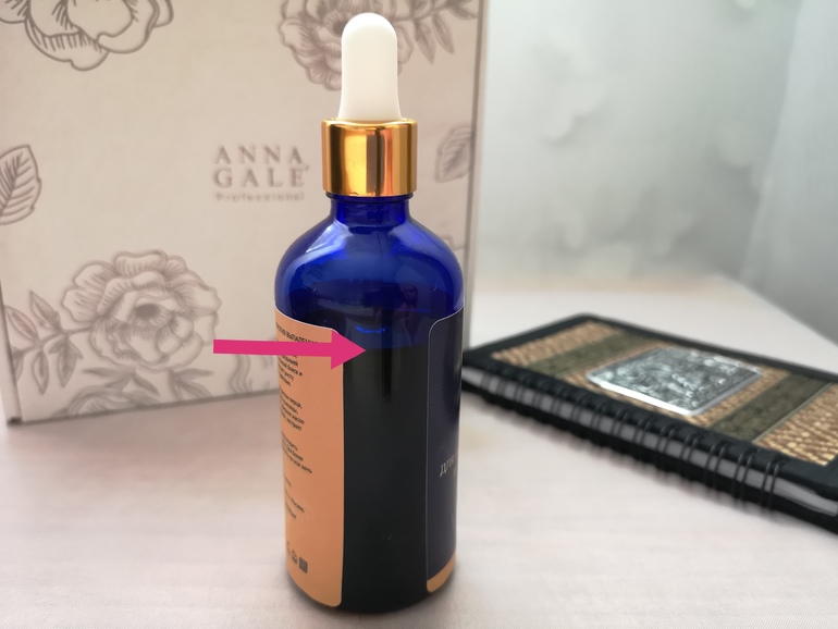 На одну процедуру у меня уходит 1,5 пипетки масла. За месяц я успела сделать 8 процедур, пузырёк опустошен на 1/6 часть. Следовательно, всего флакона мне хватит на 6 месяцев использования. На фото розовой стрелкой отмечено количество оставшегося масла в пузырьке.