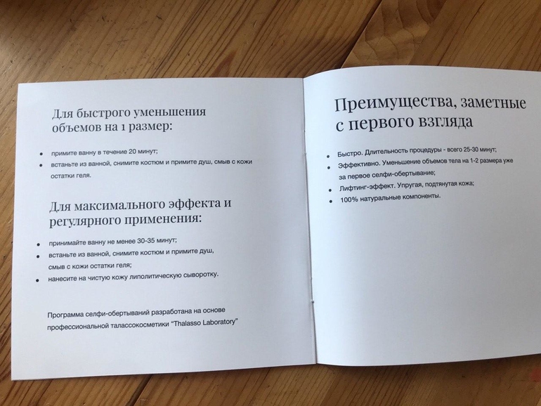 Уход за теломВчера я провела селфи-обертывание по вашим советам - обернулась и пошла в баню, хотя в инструкции было сказано лечь в воду. Мои волшебные средства - набор от Vertera для домашнего «селфи-обёртывания» Thalаsso Lab на основе водорослей. Я провела три обертывания и могу теперь сказать, что я преданный поклонник водорослевой уходовой косметики.
