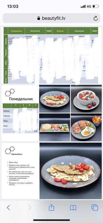 Питание нутрициолог разбирает очень подробно, на каждый день есть меню с рецептами, фото и подсчетом к/б/ж/у.
