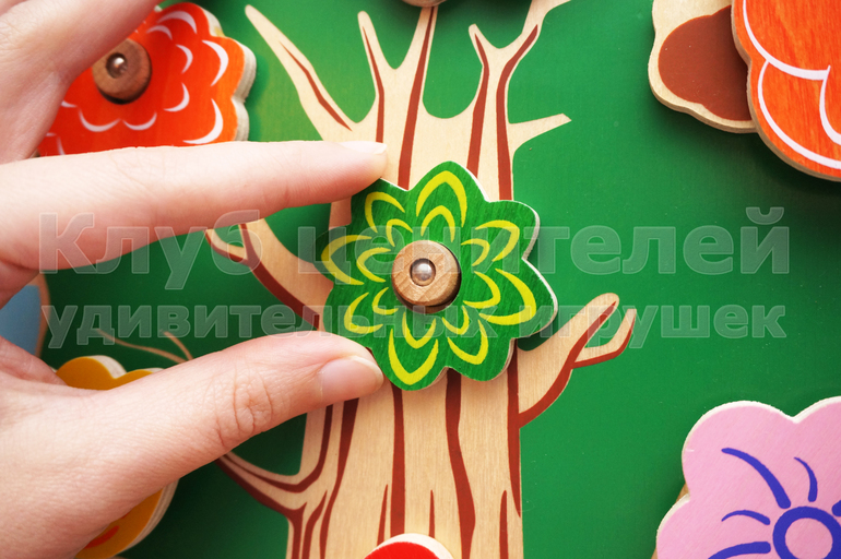 В ящичке спрятались: 31 деталь для украшения, 1 дерево, 2 винтика, 8 карточек.