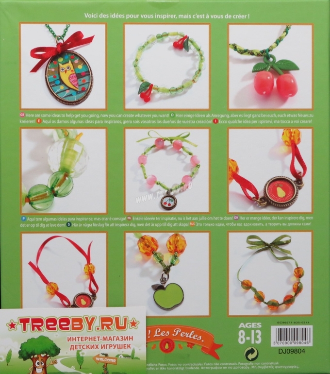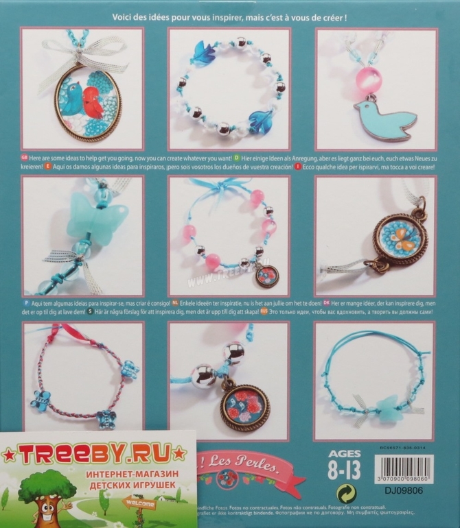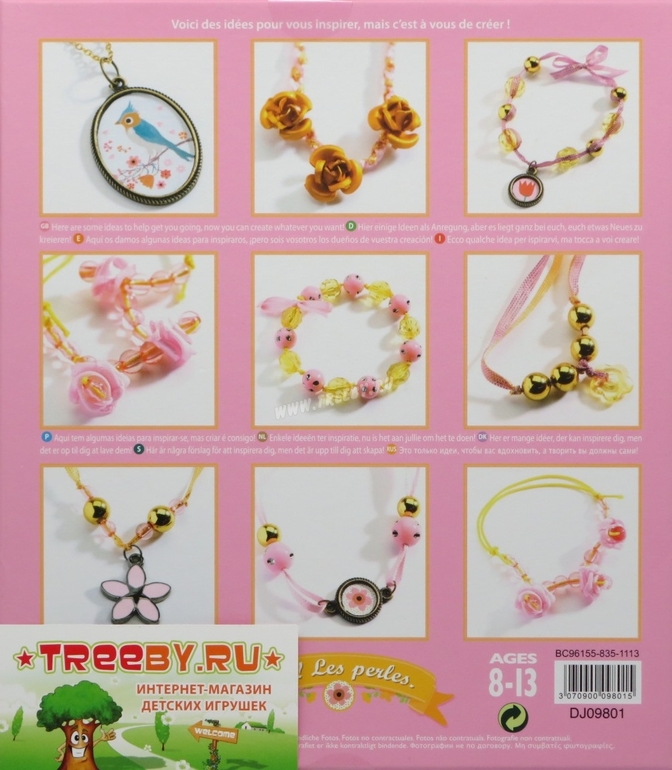 В комплекте: 4 баночки с разноцветными бусинами, катушка с разноцветными резинками и лентами, медальон с цепочкой, другие аксессуары, инструкция.