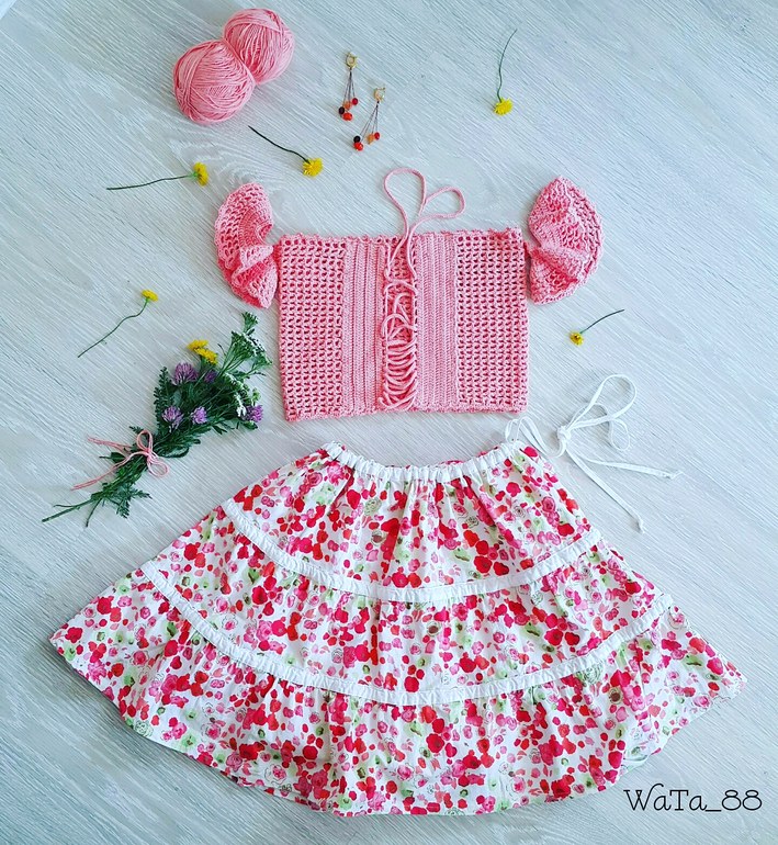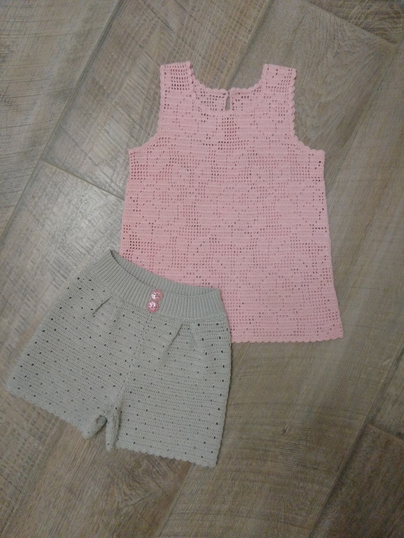Вот такой летний костюмчик связался на девочку. Нитка Pelican VITA cotton 50 г./ 330 м. На маечку ушло около 2,5 мотков, на шорты 1.5. Фото на модели пока нет.)