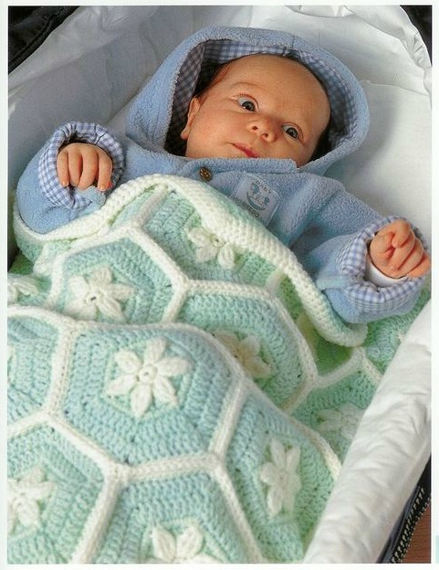 Начала вязать плед детский, очень понравился на фотографии. Схемку к нему тоже нашла, но после первого связанного мотива поняла, что схема немного не та ((
