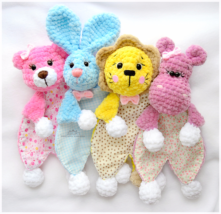Ну вот, наконец-то я готова показать Вам мои новые игрушечки-плюшевые комфортеры! Связаны из пряжи Himalaya dolphin baby. Рост от 28 до 32 см. Зайка самый крупный, мишутка самая маленькая) Ткань 100% хлопок. Головушки у игрушек меняют положение так, что комфортеры можно укладывать как на спинку, так и на животик) У всех малышей имеются самые настоящие хвостики. Все комфортеры в наличии)