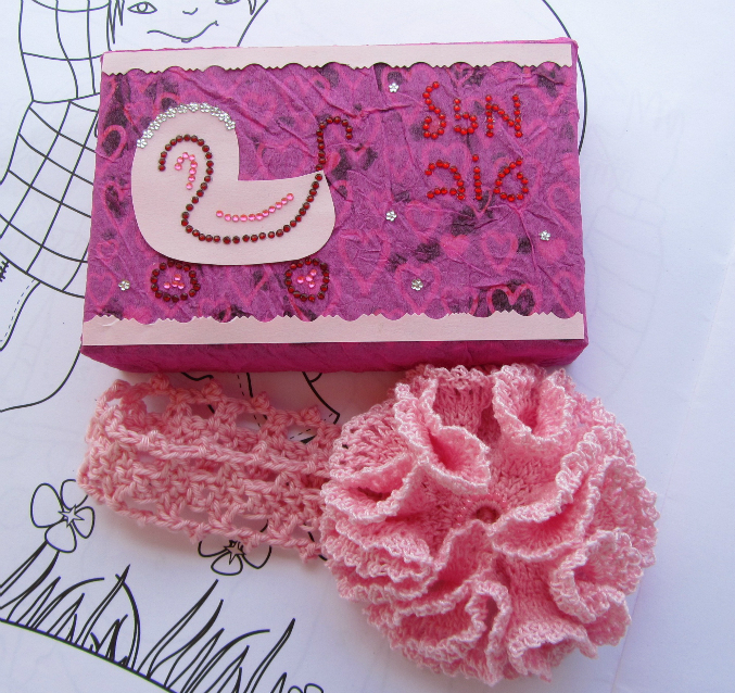 Головные уборыЭто не неудачный опыт скраба. Это попытка спасти утопающего руками самого утопающего. У сотрудника родилась дочка. Связала в подарок повязочку, а коробочки в магазине только черные. Пошкребла я по своим шкафам и по детским, наскребла бумажек и блестяшек и вот что вышло. Надеюсь, лучше чем черная.