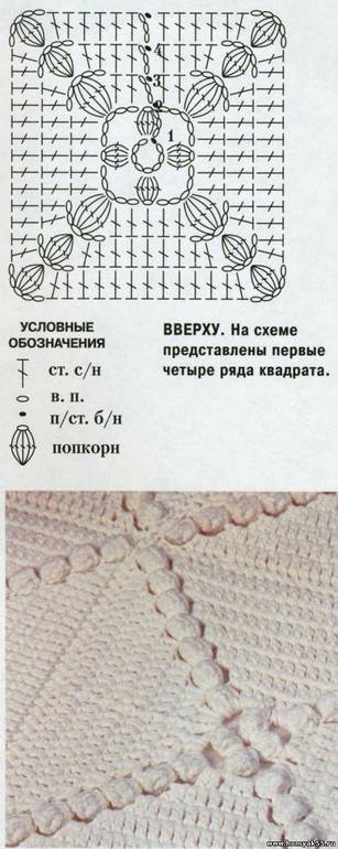Крючком № 3,5 обвяжите готовое изделие по лицевой стороне, начав от любого соединительного шва. 1-й ряд: 3 ВП для подъёма, 4 ССН в точку соединения, выньте крючок из рабочей петли, введите его через верхнюю ВП цепочки из 3 ВП в начале ряда, снова захватите рабочую петлю и протяните её через верхнюю ВП цепочки из 3 ВП, чтобы закрепить вершину начального "попкорна", * 1 ВП, пропустите 2 ВП, ССН в каждый из 13 ССН основн., ВП, пропустите ССН, "попкорн" в вершину ССН основ., ВП, пропустите ССН, ССН в каждые из 13 ССН основ., ВП, пропустите 2 ВП, "попкорн" в следующую точку соединения, повторите от * до конца, провязывая "попкорн" в вершину "попкорна" во всех четырёх углах рабочего полотна, п/ст. б/н в вершину начального "попкорна". Далее выполните по 2 зубца на каждом квадрате. Для этого провяжите: 1-й ряд: 3 ВП для подъёма, пропустите "попкорн" в основ. 3 ВП и след. ВП предыдущего ряда, "попкорн" в вершину ССН предыдущего ряда, ВП, пропустите 1 ССН, ССН в каждые из 9 ССН предыдущего ряда, ВП, пропустить 1 ССН, "попкорн" в ССН предыдущего ряда, пропустить 1 ВП, ССН в вершину "попкорна" на ряд ниже (отметьте этот "попкорн" цветной нитью), работу поверните. 2-й ряд: 3 ВП для подъёма, пропустите 1 "попкорн" и следующую ВП, "попкорн" в вершину ССН предыдущего ряда, ВП, пропустите ССН, ССН в каждый из 5 ССН предыдущего ряда, ВП, пропустите ССН, "попкорн" в вершину ССН, пропустите ВП, ССН в вершину "попкорна" предыдущего ряда. Работу поверните. 3-й ряд: 3 ВП для подъёма, пропустите 1 "попкорн" и следующую ВП, "попкорн" в вершину ССН предыдущего ряда, ВП, пропустите ССН, ССН в вершину ССН предыдущего ряда, ВП, пропустите ССН, "попкорн" в вершину ССН предыдущего ряда, пропустите ВП, ССН в вершину "попкорна" предыдущего ряда. Работу поверните. 4-й ряд: 3 ВП для подъёма, пропустите 1 "попкорн" и следующую ВП, "попкорн" в вершину ССН предыдущего ряда, пропустите ВП, ССн в вершину "попкорна" предыдущего ряда. Закрепите нить. Повторите приём вывязывания зубца для каждого квадрата, повторяя 1-4 ряды. Продолжайте работу, пока не будет обвязано всё рабочее полотно. Далее с лицевой стороны изделия обвяжите обвяжите 1 рядом СБН по всему периметру рабочего полотна, провязывая 3 СБН под каждые 3 ВП предыдущего ряда, и СБН в вершину "попкорна" в углу зубца. Закончите п/ст. б/н в 1 СБН. Закрепите нить. Чтобы край покрывала был более жёстким, можно провязать 1 ряд "рачьим шагом". Отпарьте готовое изделие. Воспользуйтесь мягкой подстилкой. Проследите, чтобы "попкорн" был на лицевой стороне изделия.