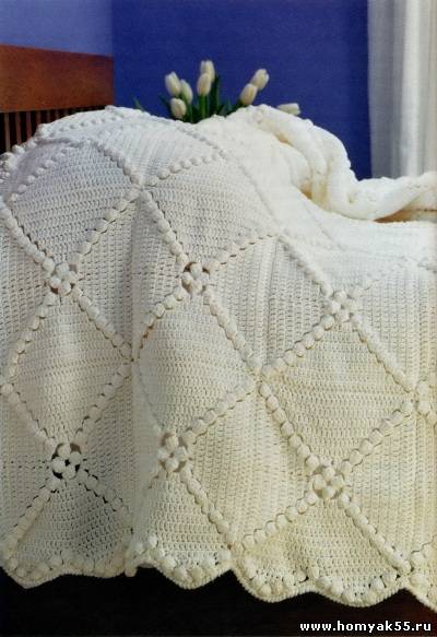 Покрывало на кровать Покрывало связано из хлопчатобумажной пряжи в традиционном стиле. Для его выполнения потребуется около 100 фрагментов, которые будут соединены между собой. Размеры Односпальное покрывало: 174 х 234 см. Двуспальное покрывало: 214 х 234 см. Материалы Односпальное покрывало: 84 мотка по 50г х/б пряжи белого цвета. Двуспальное покрывало: 104 мотка по 50г х/б пряжи белого цвета. Крючок №3,5. Плотность вязания 1 фрагмент = квадрат 20 х 20 см. Специальные сокращения "Попкорн" - провяжите 5 ССН в одну и ту же петлю предыдущего ряда, выньте крючок из рабочей петли, введите его в вершину первого из 5 ССН, снова захватите рабочую петлю и протяните её через вершину 1 ССН, чтобы закрепить вершину "попкорна". "Попкорн" должен располагаться на лицевой стороне квадрата.