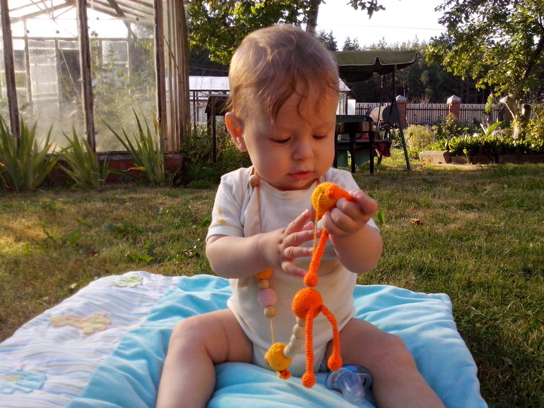 Вязаные аксессуарыВсем привет! Решила показать нашу новую игрушку - это слингобусы жирафик))) очень страшно, когда кормлю, Мишулька постоянно хватается за цепочку, она тонкая и может повредить нежные пальчики. За жирафку он хватается с удовольствием. Безопасно, развивает мелкую моторику, в дальнейшем можно по ним учиться считать, яркий, оригинальный и приятный аксесуар - развивашка. Жалею, что раньше не предложила ему такое чудо. Сейчас доделываю заказик и хочу еще браслет))) очень хочется еще сережки