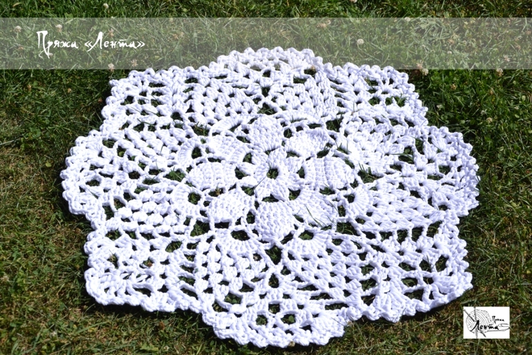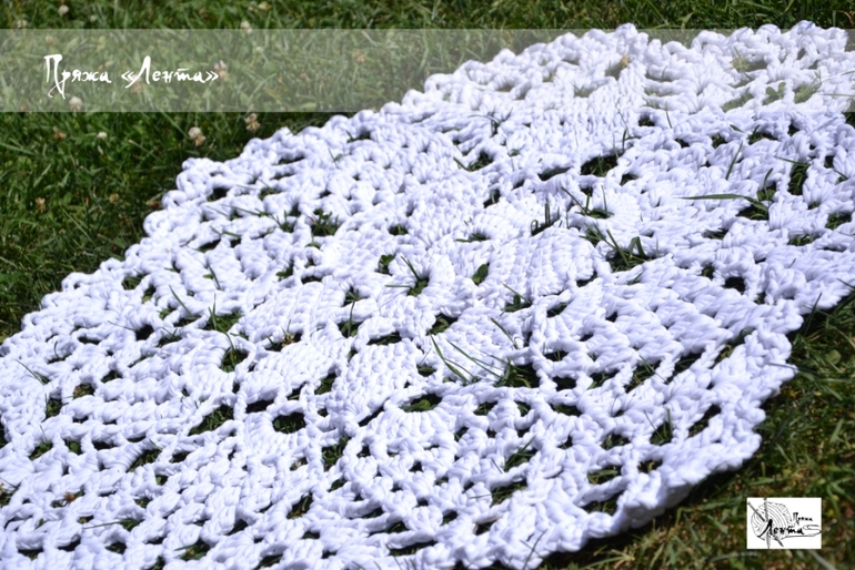 Пряжа "лента" цвет белый 4 мотка. Крючок №9. Вяжем по схеме до 13-го ряда. Диаметр 1м