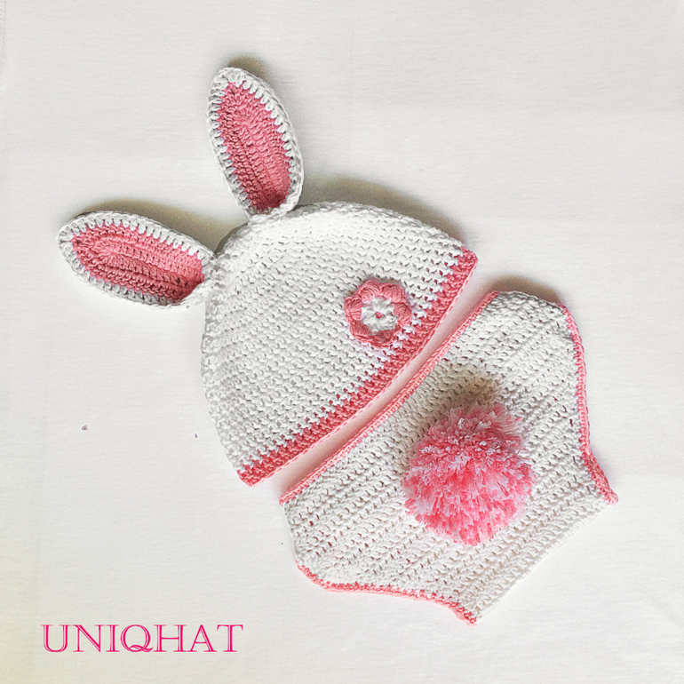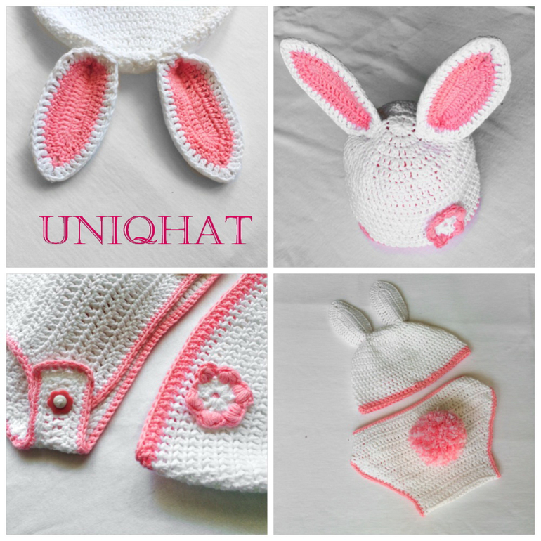 Такой замечательный комплект Зайка порадовал новорожденную Катену на ее первой фотосессии. Сделан из хлопка, ушки стоячие, пуговки подгоняются под размер.